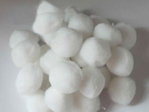 纖維球填料物理、化學性能分析 | 分析項目 | 測試數據 | 分析項目 | 測試數據 | | 密度 | 1.38kg/m3 | 濾速 | 20-85m/h | | 充填密度 | 60-80kg/m3 | 載污量 | 6-10kg/m3 | | 比表面積 | 3000m2/m3 | 球徑 | 15-25、25-30mm | | 孔隙率 | 96% | 球體外觀 | 白色球狀 橢圓狀 |