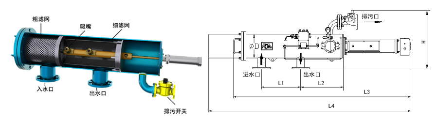 型號 管徑 出入水口 L1 L2 L3 L4 H d 濾網面積 處理水量 重量