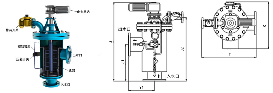 型號 管徑 J J1 J2 Y Y1 K 出入水口 重量 濾網(wǎng)面積 處理水量